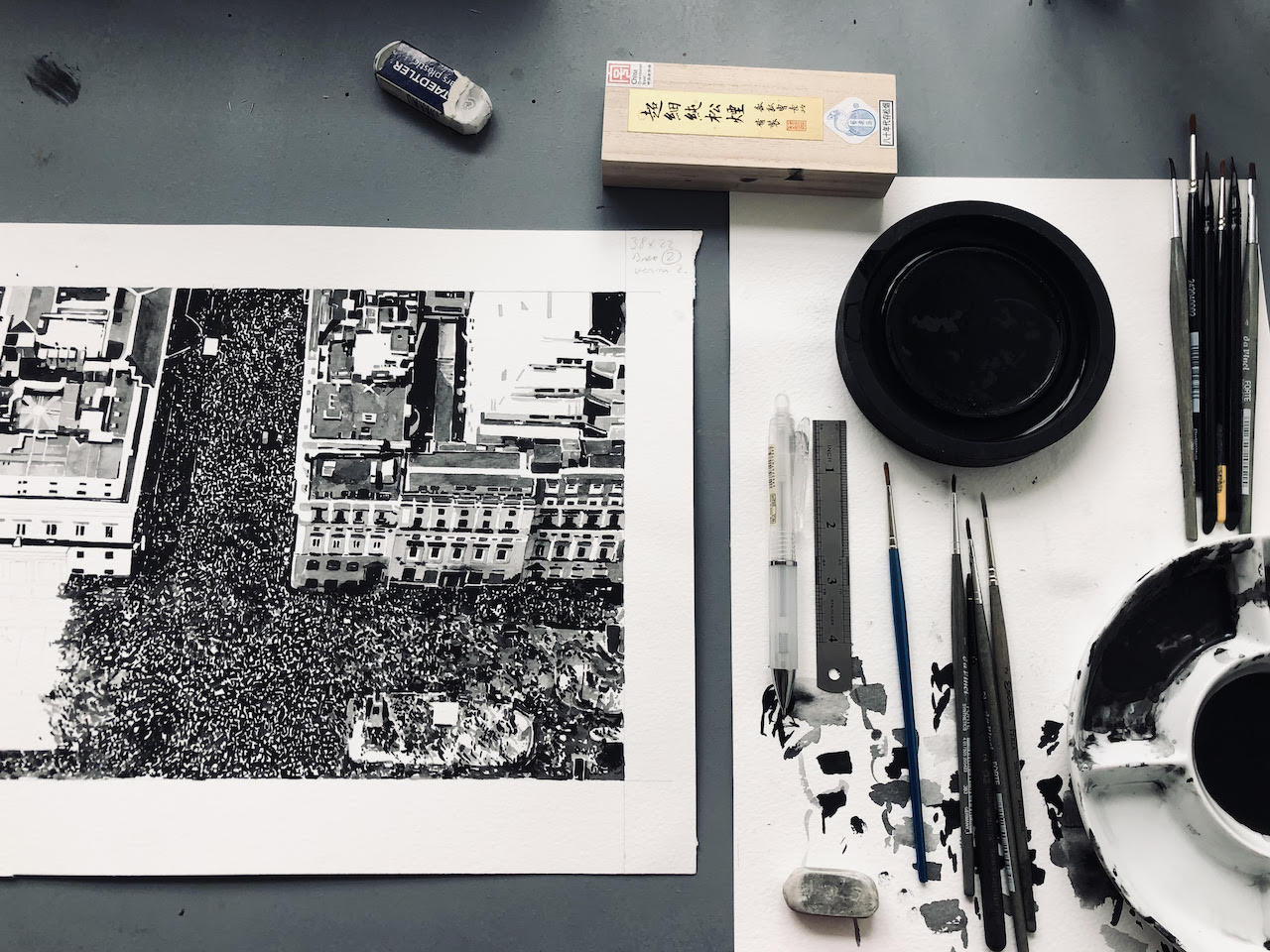 Her subjects include Climate Change, Brexit, BLM protests and women’s equality. Gerrard’s crowds are often viewed from above in built environments, indicating media surveillance. The re-scaling of news images into painterly forms disrupts our understanding of their ephemerality, permitting a reflective, critical perspective on the excess of media representation. Gerrard treats built environments and public spaces as equal participants within the images: providing context, physical constraint, but also symbolic power.