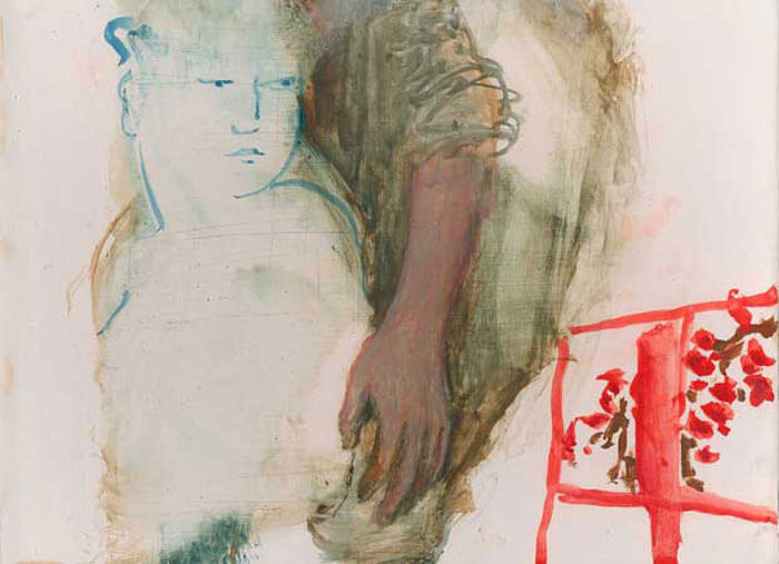 This hidden narrative together with the deft and committed handling of materials makes for an uneasy balance and tension in her work. It is as if she is telling you something but not quite. Works such as Don’t Look Now, featuring a naked child embracing a blue rabbit are, at first glance cute, appealing images. However there is a darker side to the apparent softness of this picture, named after the unsettling 1970’s film set in Venice. The title work of the exhibition is a medium size triptych featuring a heron bird rising from the central panel, either side elemental seascapes appear in yellows and browns. The work suggests a strange juxtaposition of feelings – that of drowning and being saved at the same time.