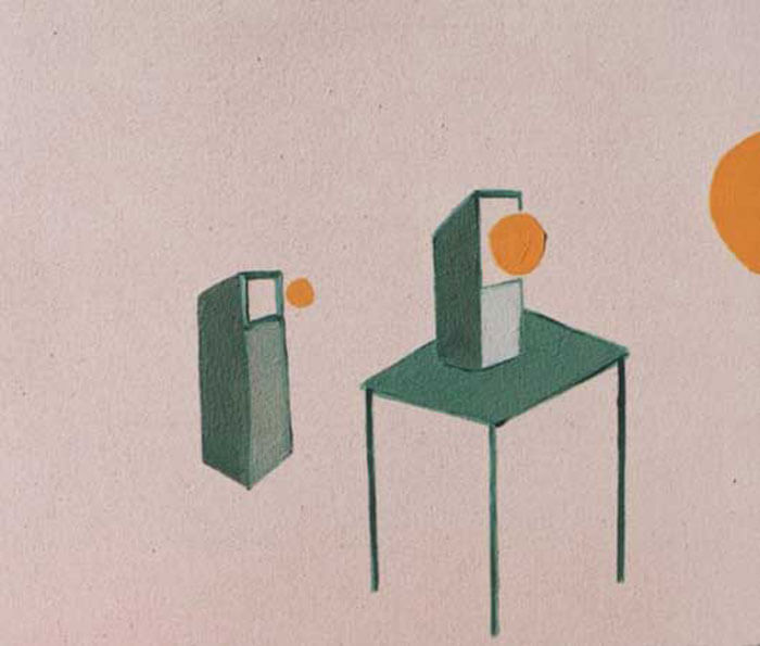 In this series of paintings, simplified representations of orbiting bodies, radio waves and patterned signals co-exist in compositions alongside rudimentary architectural structures, occupying an environment devoid of human presence. The painting Transmitter-Receiver typifies this underlying substructure of a modern day episode. A solitary building with radio waves observed as brightly painted lines, operates in an otherworldly atmosphere, conjuring notions of a forensic habitat, quietly removed from human interaction. The exhibition also includes the triangular painted sculpture Prism 2006.