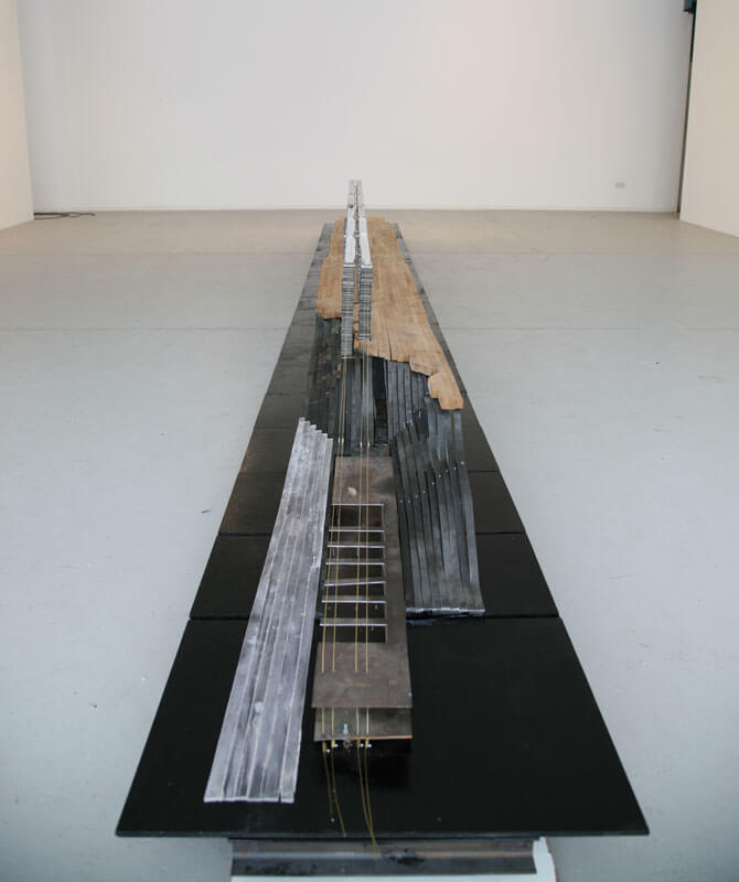 Cathal Curtin Amplitude, 2009. 8.3m x 0.8m x 0.7m, teak, steel, PVC sheet, fishing line, break cable, brass welding rod, aluminum tubing, glass, 9mm plywood, black paint (gloss), M4 cable fixing bolts, 30mm timber screws, M6 brass welded cable tension fixings. Photo Credit: Sean O’Reilly