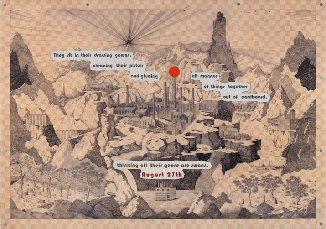 April 22nd is the sixth of an ongoing series of monumental drawings, started four years ago, depicting in word and image, the visualized diary entries of a fictional ‘Grand Tourist’ and flâneur, Albert Sitzfleisch.
