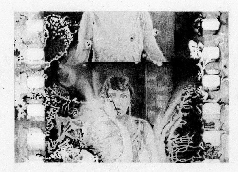 Brian Fay, 2 frames Swanson damaged nitrate film stock 1922, 2010, Pencil on paper, 29.7 x 21 cm, Image courtesy of the artist.