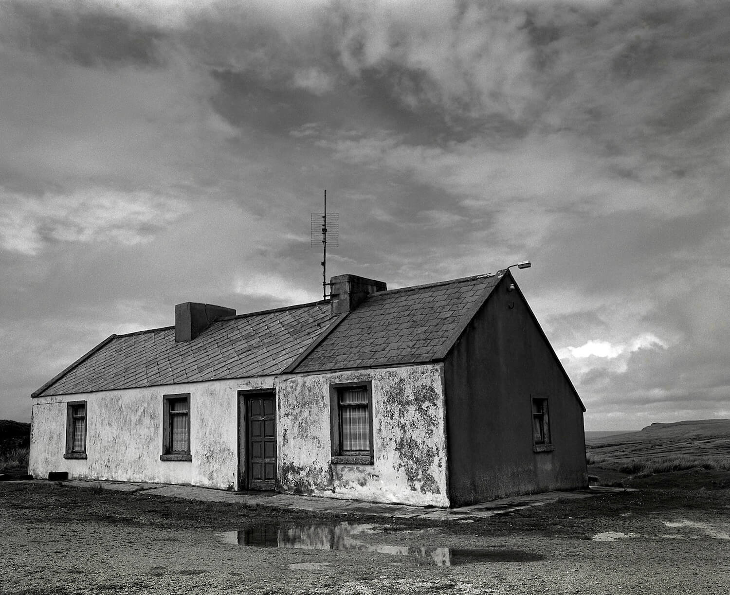 Habitations, sometimes domestic, sometimes agricultural, and sometimes an evolution from one to the other vie with the topography for equality under the indifferent and vast sky. Photographed with a sense of theatricality under the great sky’s and weather patterns that are ever present in North Mayo. There is an implied presence in the vocabulary used to describe these structures, the family name of previous inhabitants or owners. The human connection still alive in the vocabulary of the local inhabitants, a verbal History.