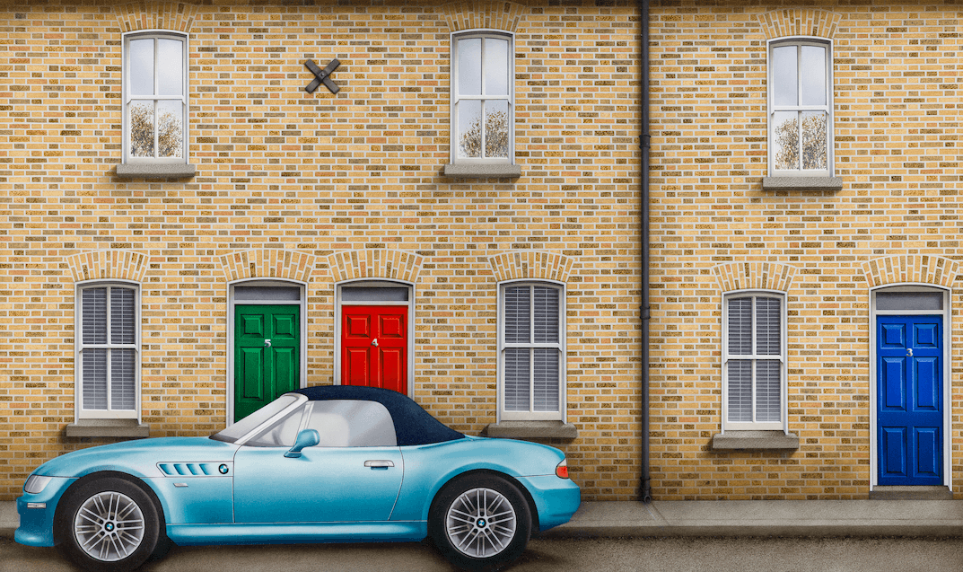 Today, we inaugurate the latest in this intermittent series, Home, 2020. Designed in the form of a medieval altarpiece, its closed panels show the outside of a series of terraced houses No. 3, 4 & 5. It bears comparison to the first in the series, No.3 painted in 1977, a swathe of forty-three years intervening between the images. They share the attention to detail where the artist builds up the façade of the building brick by brick, stroke by stroke. In 1977, the rear of a family Ford Cortina Estate pokes into the composition, in 2020 a fully rendered BMW sports car is parked in front of the home, suggesting much has changed in the artist’s circumstances in those intervening years. No 3, depicts the artist’s two children and his wife Betty peeping out of the hall door. Ballagh, who appears in most if not all of these paintings holds a copy of an American self-help book in front of his face How to make Art Commercial – a necessary skill for a husband and father of two.