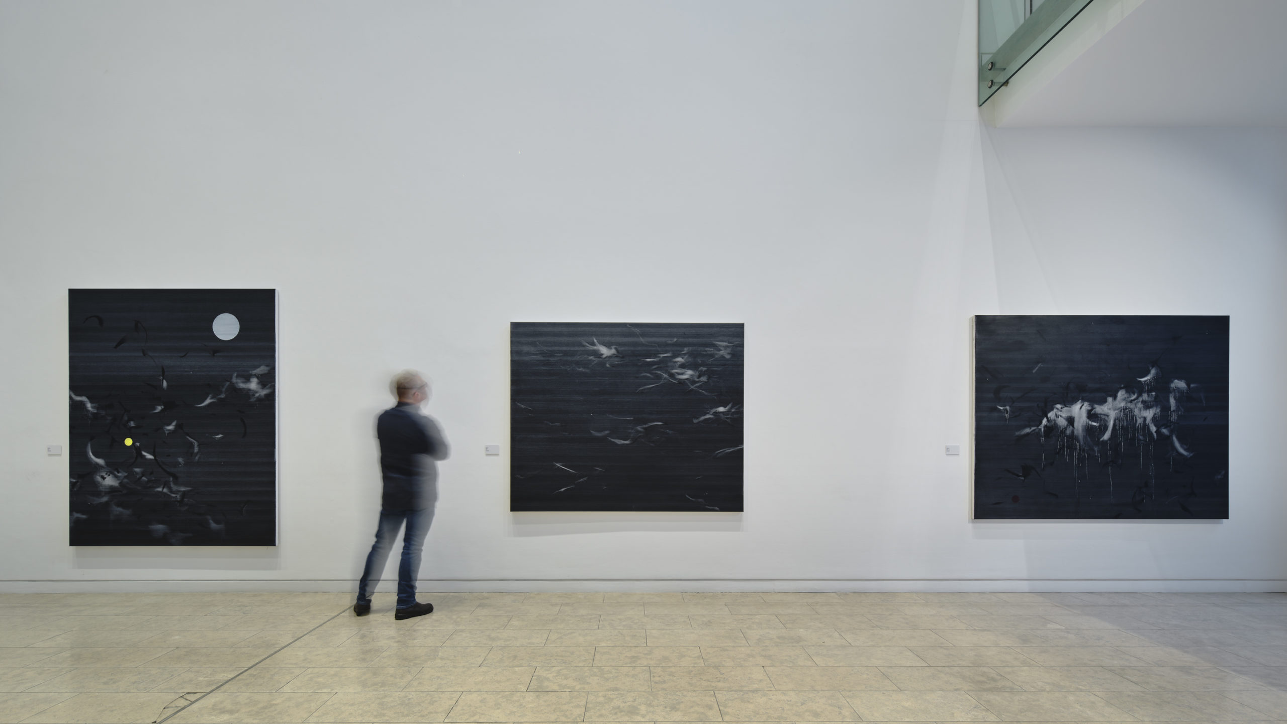 Kwok works at scale. The paintings are experiential, with the intention of echoing emotions through relatable threads, sharing the feelings of isolation and instability, whilst resting in a calm space. The surface of the paintings are muted and largely monochromatic, composed of many thin layers of paint which reveal traces of each previous existing iteration and identity.