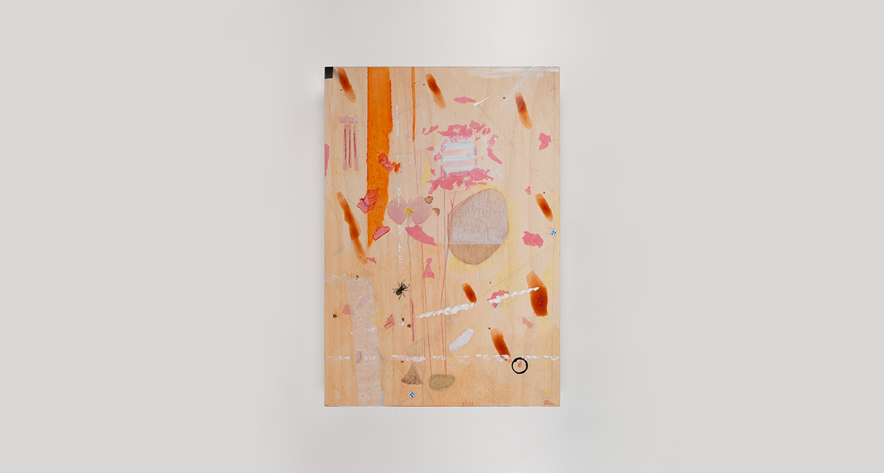 An ephemerality permeates the artist’s works, as if only thin membranes mark them off from each other and their surroundings. The use of aquarelle and collage in combination with natural resin and acrylic binder enables the creation of thin layers, glazes and washes, similar to oil painting, although less toxic on hands, inhalation, and on the earth. Water has a connection with the body, and its use as a resource in this work gives the paintings a fibrous, biological, even delicate nature. Colour itself becomes aqueous. Textural polarities offset each other, shininess and stickiness, identifiable and indeterminate shapes. Chalky patches are brought into a relationship on one plane with detritus from scrapbooks, like that of falling flowers – fragments are assembled and recomposed to create meaning.