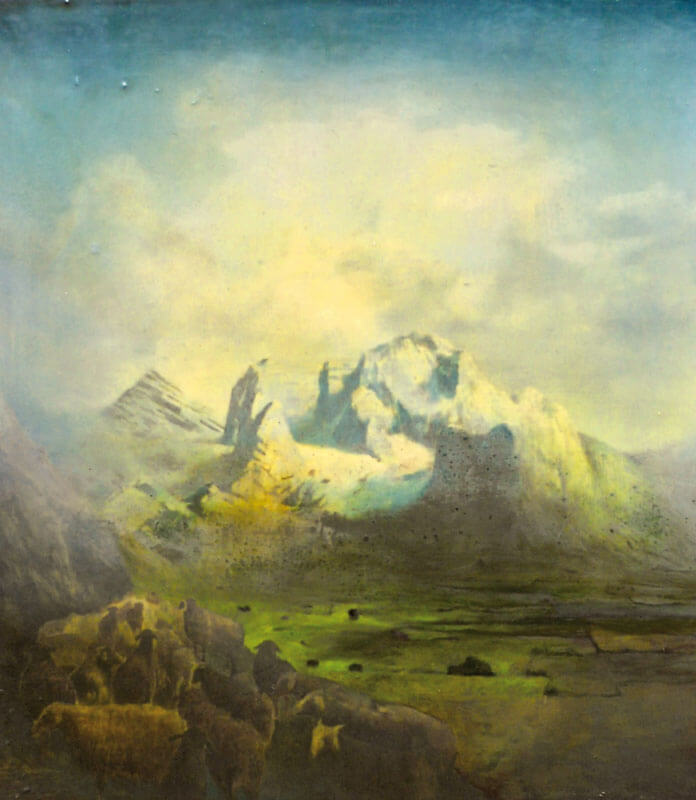Over the past few years Sam Douglas has travelled to various mountain ranges – the Himalayas, Caucasus, Atlas and Picos de Europa. These places have filtered into a recent series of paintings and serve as the starting point for the mapping out of an invented territory. The geographical and cultural isolation of such places offers space for escapist reverie, which once returned to the studio is explored through painting processes that attempt to refer to the geology and atmosphere of the mountain landscape. Erosion and sedimentation are present ifile:///Users/johnpower/Downloads/2013_11_15_Retreat_Promo-0233.tifn repeated sanding back, over painting and the pouring of successive layers of varnish and linseed oil to create an often-dense surface and atmosphere that both occludes and vivifies the image. The burial and uncovering of elements within this surface is also suggestive of archaeological activity, with ambiguous forms half sunk in the strata of the paint- cryptic architecture, unnatural outcrops of rock and the remnants of mining and quarrying occur throughout the work.
