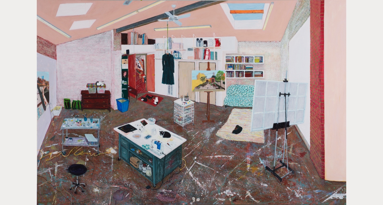 03. Sarah McEneaney, Studio, 2018, acrylic and collage on wood, 121.92 x 182.88cm. Image courtesy of the artist and Locks Gallery, Philadelphia, Photography John Carlano.