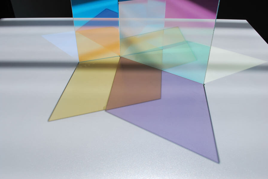In Sunlines 2010, Roche exploits the quality of dichroic glass to change colour as sunlight hits it at different angles. This four part piece is a simple and quiet meditation on time and change.