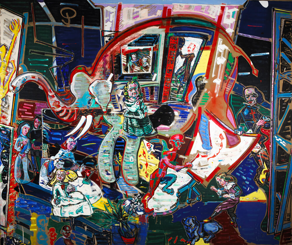 Fast forward to November 2000. On the day my youngest daughter Emily was born I went into my studio after her birth and drew the outline in red paint of an elephant – along with the figure of a painter painting, going full throttle, which stands in for the Demiurge in the throes of making the world visible in paint. The action is taking place in my studio, on a canvas the same size as the aforementioned one above. Gordon Woods, a fellow artist from the north of Ireland, had gifted the stretcher for this canvas to me. I spent a long time stitching three enormous pieces of linen together by hand, so as to honour his gift. A couple of days later I was standing in the studio when from the painting racks above my head fell an old preparatory drawing, in watercolour, for the Annaghmakerrig Las Meninas study. This prompted me as to how I should celebrate Emily’s arrival in the world. She became, cast as the Infanta, the pivotal point of the painting.