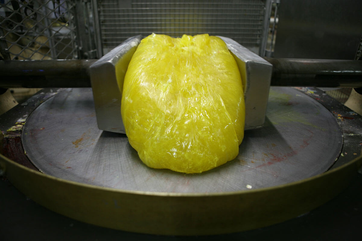 In 2007, Abigail O’Brien RHA spent a three month residency in the Oatfield Sweet Factory in Letterkenny County Donegal as part of a Percent for Art Scheme of Donegal County Council. O’Brien was determined that the work produced there would have a metaphorical reach far beyond the documenting of the sweet making process and for that ambition she took the Cardinal Virtue of Temperance as her guide and theme. Temperance can most simply be defined as ‘self-restraint in the face of temptation or desire’ and in these sumptuous photographs of the manufacture of confectionary’s desire the artist succeeds in moving us into the moral realm.
