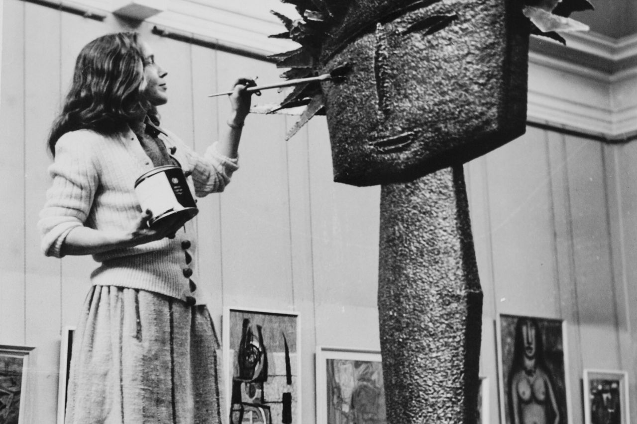 Image: Hilary Heron varnishing Crazy Jane III (1958) at the Irish Exhibition of Living Art 1958. Image courtesy of the estate of Hilary Heron.